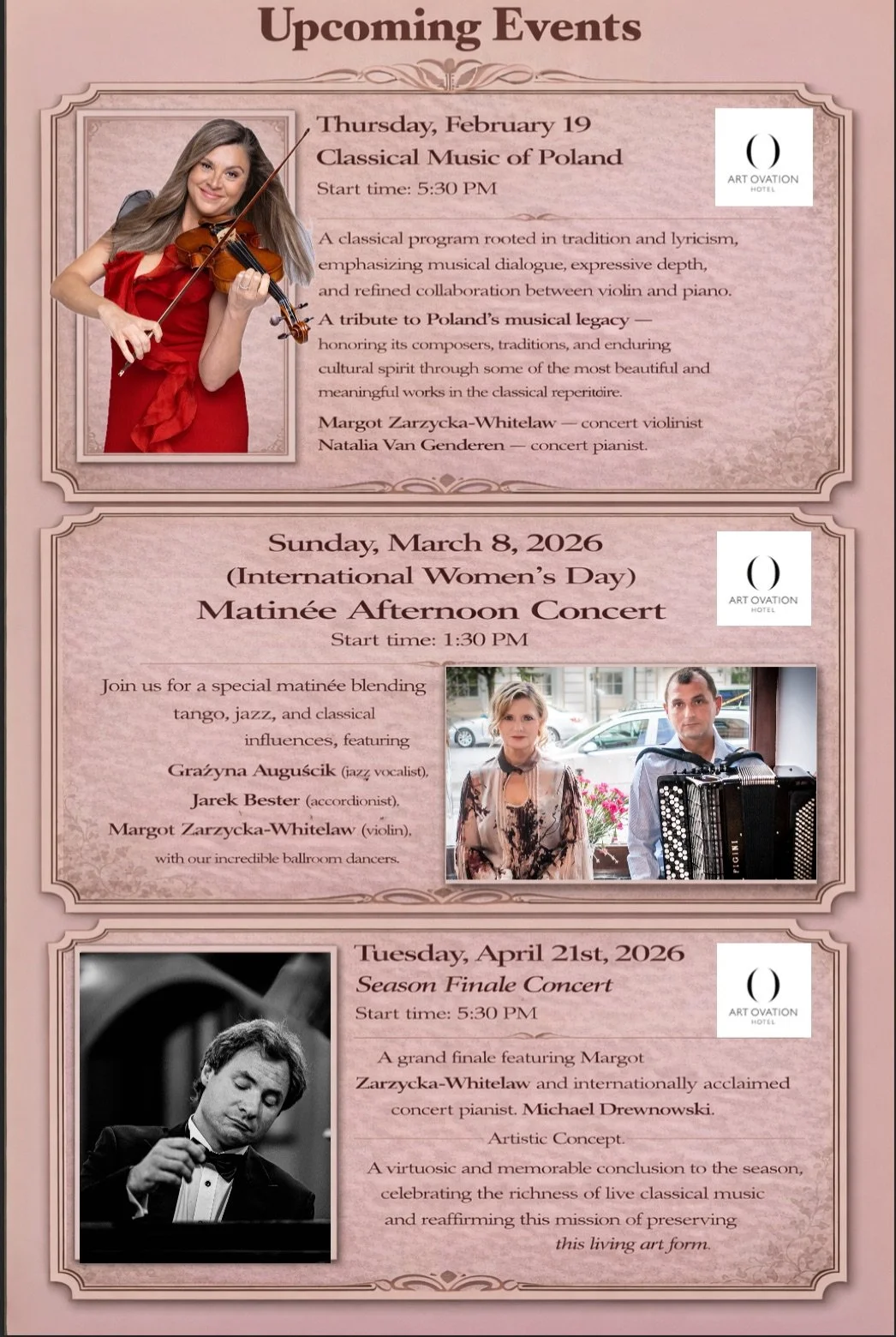 Seating is limited. If you are interested in attending the March 8 concert or inquiring about hosting a private performance, we would be pleased to share further details.